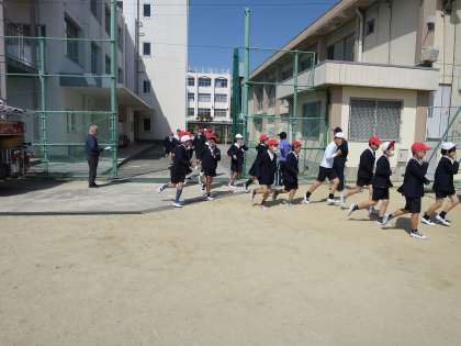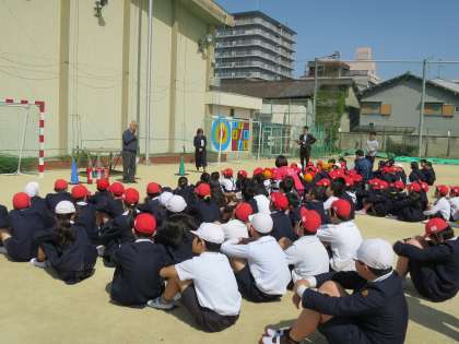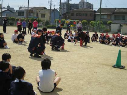生野消防署の方にもお越しいただき、火災を想定した避難訓練を行いました。運動場に避難した後は、消火器の使い方を教えていただき、水消火器体験を行いました。いざという時のために、合言葉は「お・は・し・も」です!