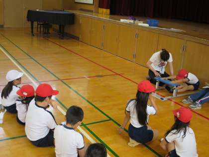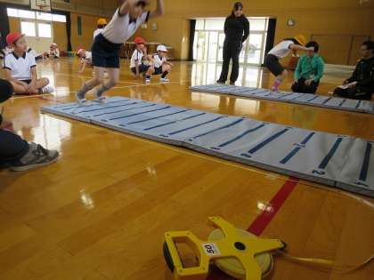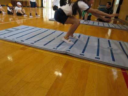 3・4年生が合同で、立ち幅跳び・長座体前屈・握力を測定しました。やる気いっぱいです!