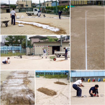 業者の方に来ていただいて、運動場の整地作業とトラックのラインテープ設置作業が行われました。整地作業は2月にしてもらったのですが、今回は、その際に気になった部分の集中補習作業でした。