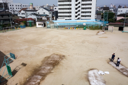 運動場の「気になった部分」というのは、西側部分と東側体育倉庫前あたりです。土が流されて低くなってしまい、水たまりができやすかったり、川筋が残ったりしていました。そこで、その部分に土を追加し、にがりと合わせて押し固めました。