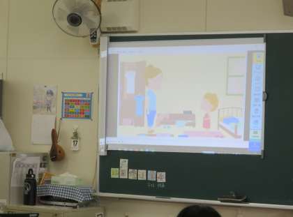 今日から、毎週火曜日と木曜日の「イングリッシュタイム」が始まりました。あいさつをしたり、DVDのお話を見たり、歌を歌ったりしました。初めて見るストーリーでしたが、たくさんの気付きができたようです。