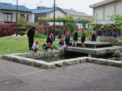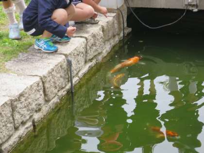 中庭の池の立派な鯉。子どもたちにも大人気です。管理作業員さんにえさをいただいて、一粒一粒大切に鯉にあげています。鯉が食べてくれると嬉しそうです(*^_^*)