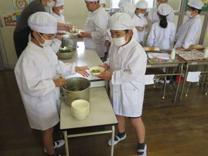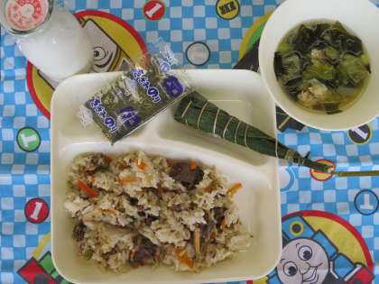 今日の給食は、こどもの日の行事献立でした。大きく元気に育ちますようにという願いがこめられた献立です。牛肉のちらしずしやすまし汁、ちまきでお祝いしました。ごちそうさまでした。