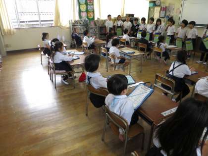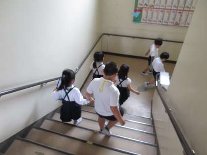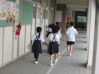 わくわくの学校探検!1年生の教室に2年生が迎えに来て、グループごとに出発しました。1年生と2年生が仲よく手をつないで、さあ学校探検へ!
