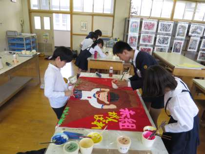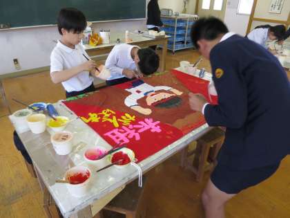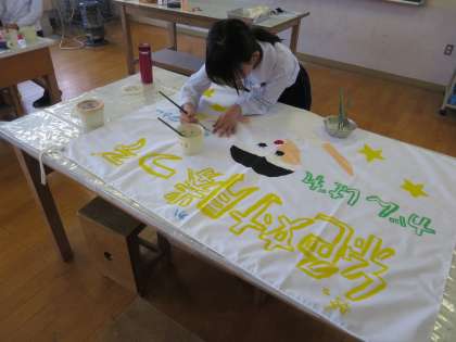 赤組も白組も応援旗を作成中です。友達も手伝いに来てくれていて、楽しく、でも真剣にがんばっています。完成が楽しみです。