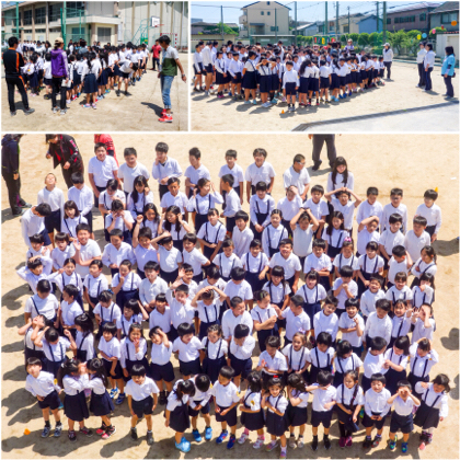2枚目は、全校児童+教職員の集合写真です。非常階段の3階から撮影しました。カメラマンさんの指示の声と、カメラのシャッター音が響きます。