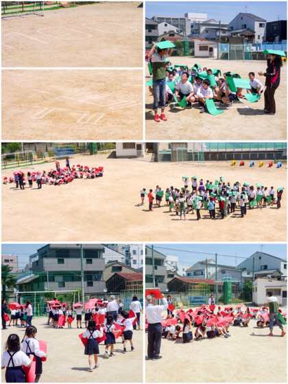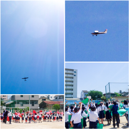 一人一枚画用紙を持って運動場へ。画用紙の持ち方や撮影時の立ち位置を確認して、セスナ機の飛来を待ちます。