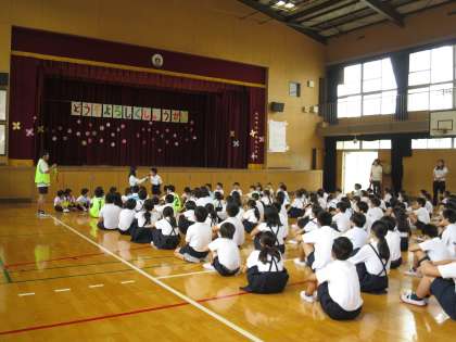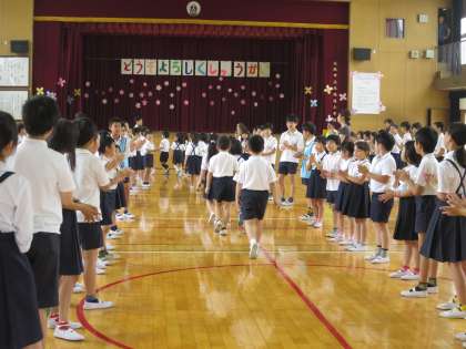 1年生を迎えての初めてのたてわり班活動「どうぞよろしく集会」がありました。1年生の入場から始まり、インタビュー形式で自己紹介をしました。児童会のお兄さんお姉さんの手作りメダルもいただきました(*^_^*)