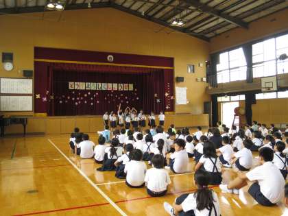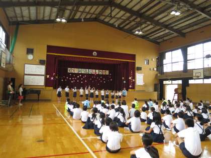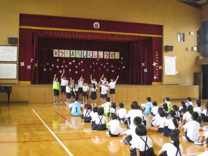 たてわり班ごとに、班のめあてを発表しました。振り付けも加わって、楽しい紹介になりました。今年1年間、仲よくがんばっていこうね!