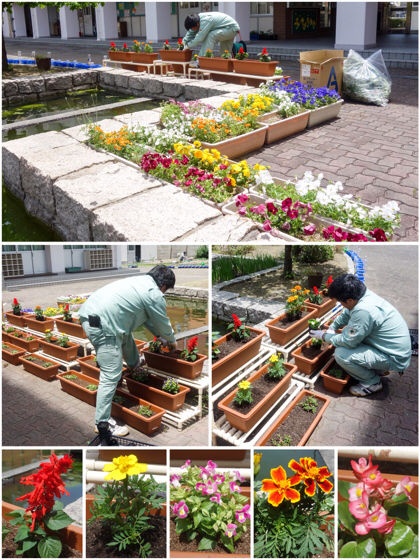 池の前のプランターが新しくなり、色とりどりの花の苗が植えつけられました。サルビア、マリーゴールド、トレニア、ベゴニア…華やかですね。