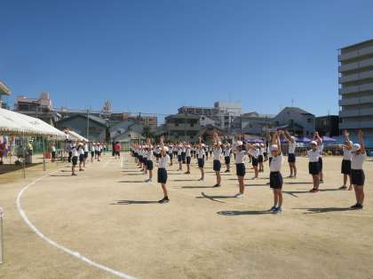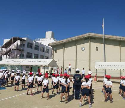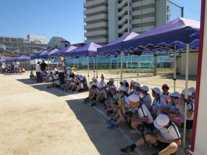 礼をしたり、運動会の歌を歌ったり、ラジオ体操をしたり、みんなでそろうとかっこいいです。暑い中練習した後は、テントの下でお茶休憩です。明日もがんばろう!