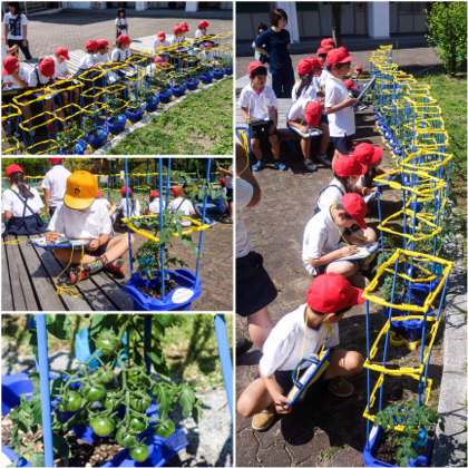 1時間目、中庭で栽培しているミニトマトを観察する2年生の様子です。