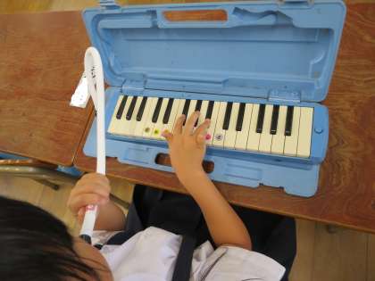 初めてけんばんハーモニカを吹いてみました。今日は「ド」を長く吹いたり短く吹いたりしてみました。最後に、黒鍵を使って救急車の音にも挑戦して一人一人音を発表しました。