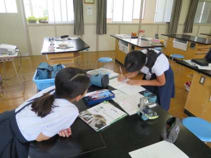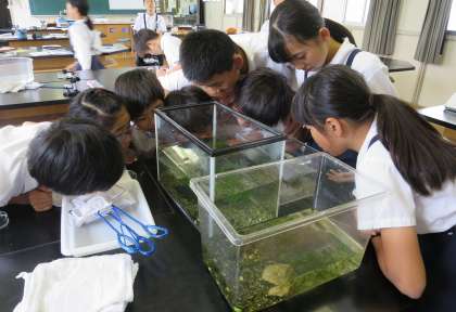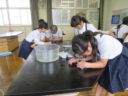 朝、めだかのたまごを発見し、早速顕微鏡を使って観察しました。たまごからかえったこめだかも。「見せて!見せて!」と嬉しそうです。観察した後は、記録を仕上げました。