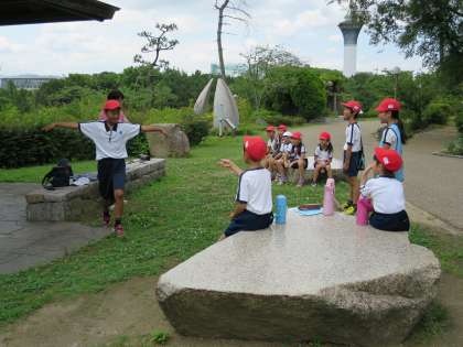 鶴見緑地公園に行きました。たてわり班に分かれて公園内をオリエンテーリングします。ポイントには先生たちが待っていて、子どもたちは班で協力していろいろなゲームにチャレンジしました。お弁当も班のみんなでおいしくいただきました。お弁当を食べた後は、緑豊かな原っぱでみんな遊びを満喫しました。楽しい思い出がまた一つ増えました。