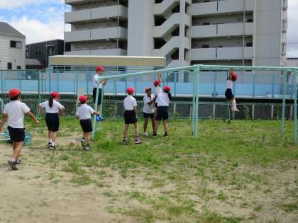 今日から1週間、たてわり班で「元気っ子パーク」に取り組み、いろんな運動を楽しんでいます!たてわり班らしく、高学年が低学年に優しく優しく教えてあげたり、手助けをしてあげたりしています。