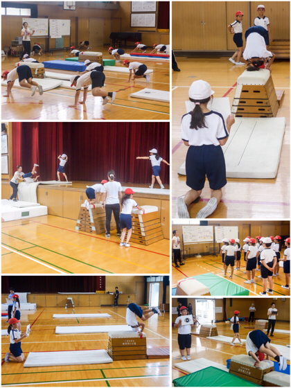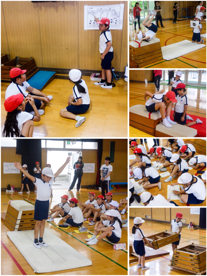 5時間目、講堂で体育の学習。校内の研究授業ということで、たくさんの先生方が見つめる中で行われました。この時間は、跳び箱運動の「台上前転」にチャレンジです。