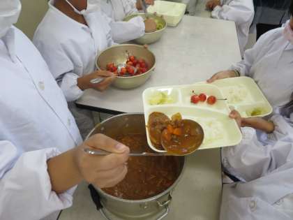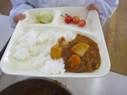 今日の給食では、山形県から届いたさくらんぼがでました。つやつやであまくておいしかったです!ラッキーにんじんが入ったハヤシライスもありました。ごちそうさまでした。