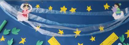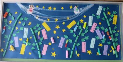 今月の玄関の掲示板には、4年生の作品が掲示されています。天の川にひこぼしさまにおりひめさま、そして願いが込められた短冊に、素敵な飾りまで(*^_^*)かわいいです。