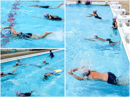 前半は、水中姿勢・バタ足・腕回し・息継ぎを、プールの壁や横の距離(12m)を使って練習。後半は、プールの縦の距離(25m)を使っての練習です。
