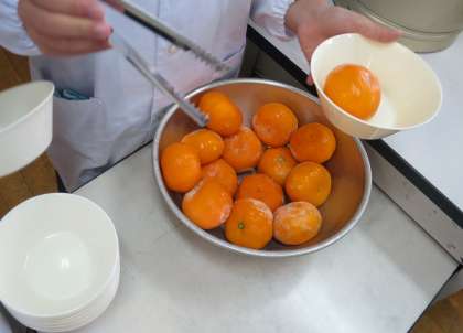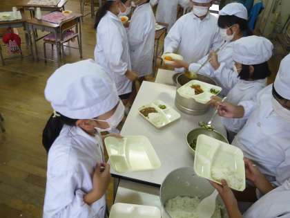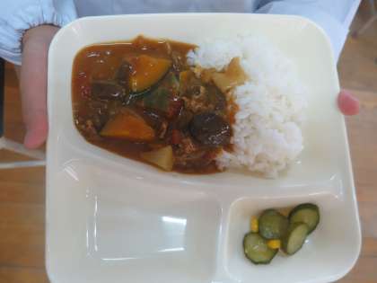 今日の給食には、子どもたちが大好きな夏野菜のカレーライスがでました。カボチャにナス、ピーマンに、トマトなど、野菜がたっぷりのルーです。デザートには冷た〜い冷凍みかんも!ごちそうさまでした。