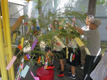 憩いの家のおじいちゃんおばあちゃんと一緒に、笹の葉に折り紙で飾りつけをしました。折り方を教えていただいたり、飾りつけを一緒にしたりしました。3年生からのお礼の歌やリコーダーでは、一緒になって歌ってくれたり、手拍子をしてくれたりしました。おじいちゃん、おばあちゃん、いつまでも元気でいてね。ありがとうございました。