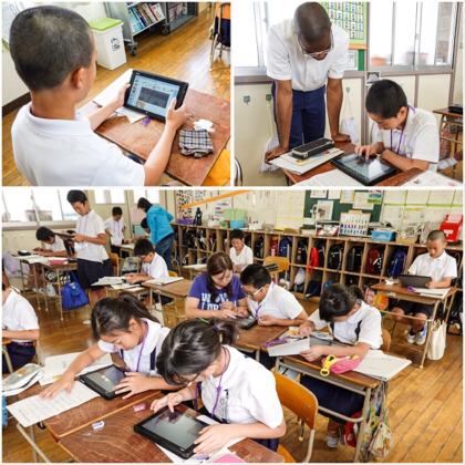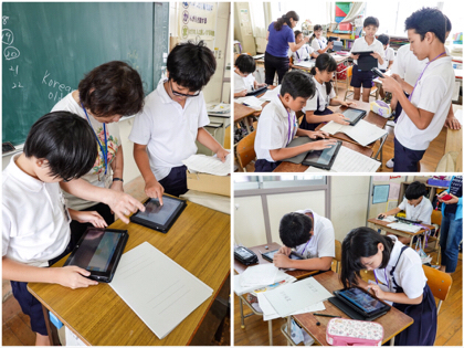 2時間目の外国語活動。タブレットを使って、発表用のスライドづくりをしていました。