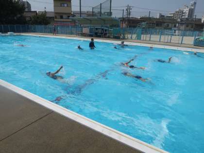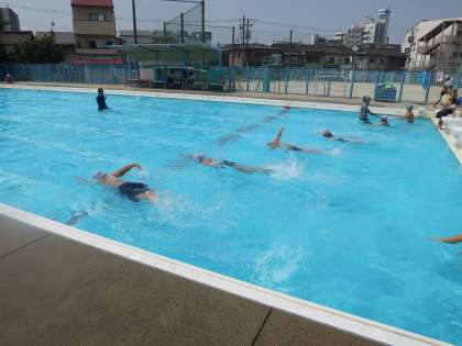 プールサイドの気温は35度を超えていて、温水のような気持ちのいいプールでした。3年生は、4年生にお手本を見せてもらったり、先生に教えていただいたりして、初めて平泳ぎにも挑戦しました。難しいけど、うまく泳げると嬉しいね!!