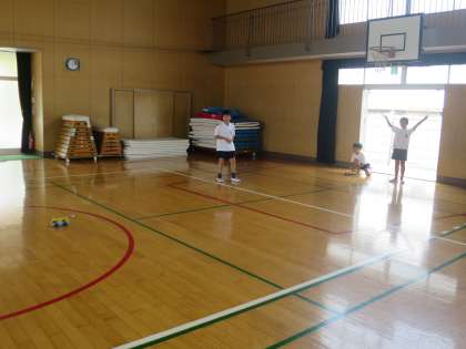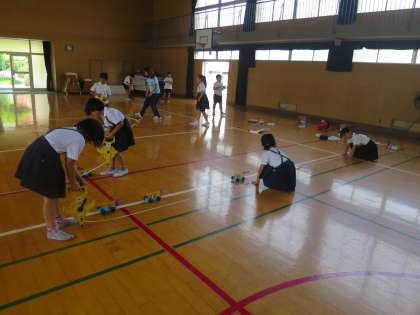 ゴムを巻く回数を変えると、プロペラカーの進む距離がどのようにちがうのかを実験し、グループで距離の計測もしました。たくさん巻いてビューー−ンと進むとにっこり!