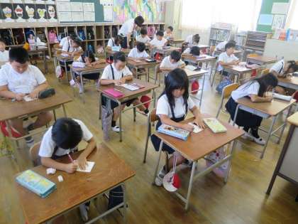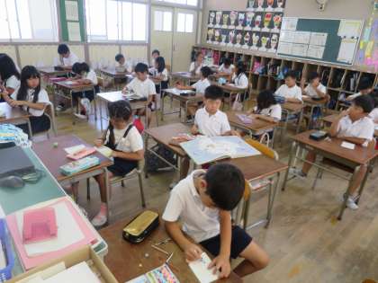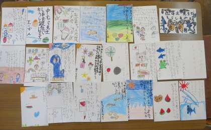 暑中はがきの書き方を学習しました。誰に書こうかな?どんな絵を添えようかな?受け取ってくれる相手のことを想像して、心を込めて書きました!