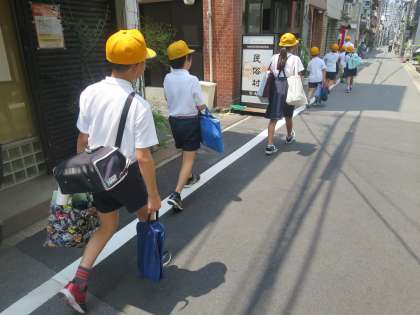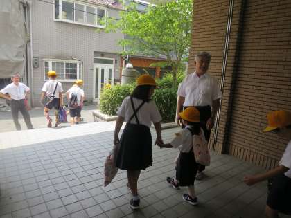今日は、登校班ごとに集団下校をしました。中庭に集まってみんなで「さようなら」をした後は、校長先生と教頭先生にお見送りをされて学校をあとにしました。