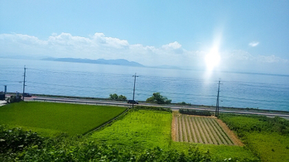 「Mother Lake」母なる湖、琵琶湖。電車は、滋賀県に入っています。