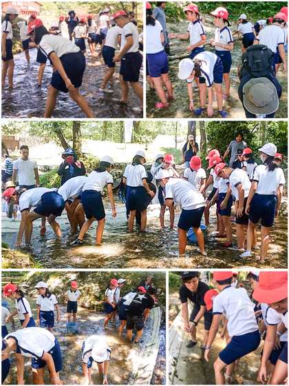 林間学習、一つ目のアクティビティは「魚つかみ」です。川に放たれた威勢のいいマスを、素手でつかみとります。