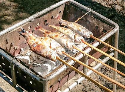 とれとれのマスを、その場で塩焼きに。新鮮さ、この上なし。