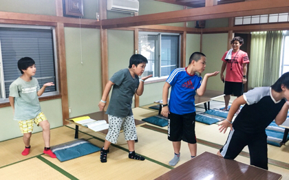 今晩のキャンプファイヤーに向けて、スタンツ(出し物)の練習に余念がありません。グループごとにスタンツがあるようです。