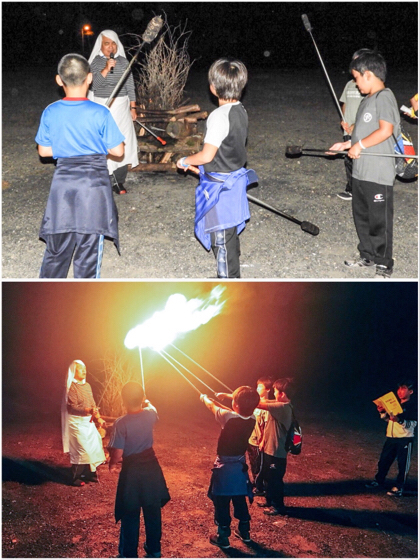 よく見ると、マザーテレサも入っている火の神から、5年生に「聖なる火」が渡されました。感動的な瞬間です。