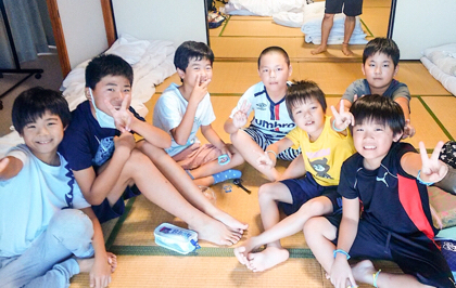 寝ぼけまなこでピースサイン。お家の方、見てくれてますか? みんな元気にやってます!