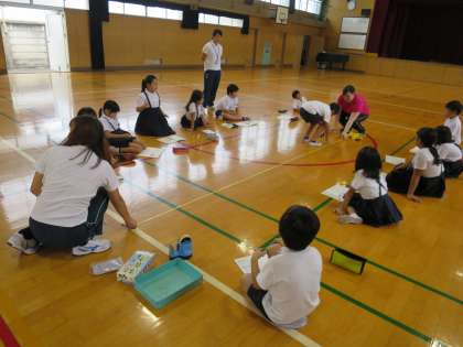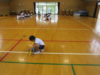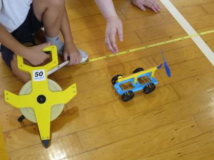 プロペラカーを使って、1学期の実験の続きをしました。1台のプロペラカーの行方をみんなが大注目していました。先生と一緒に記録を測定して、結果を記録しました。