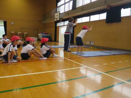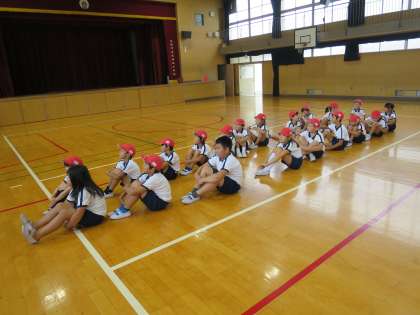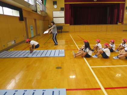 立ち幅跳びの記録を測定しました。記録が伸びる跳び方のコツを先生に教えていただいて、いざ測定です。2回記録をとりましたが、1学期よりも記録が伸びている児童がたくさんいました。順番の待ち方もかっこいいね。