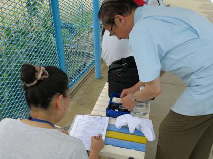 薬剤師さんによるプールの水質検査がありました。プールや洗体槽の水の状態を調べたり、持ち帰って培養して検査したりしてくださいます。学校のプールはみなさんの健康や安全を第一に考えて行われています。