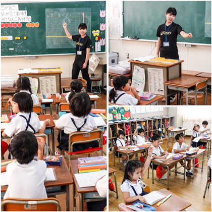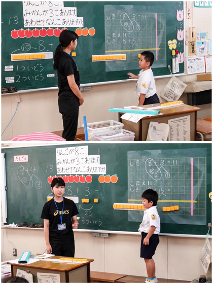 4時間目、算数の学習。「りんごが8こ、みかんが3こあります。あわせてなんこありますか。」という問題にチャレンジしていました。