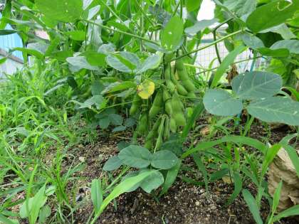 北鶴橋小学校は緑がいっぱいです。学習園には、立派なみずみずしい野菜がたくさん育ってきています。なすびにきゅうりにえだまめ・・・たわわに実っています!