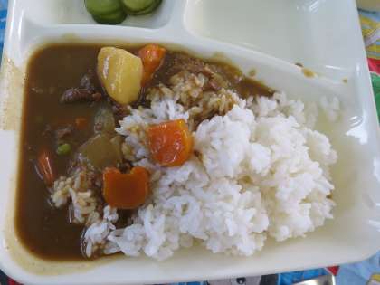 今日の給食は、米粉のカレーライスでした。いろんな形のラッキーにんじんも入っていました。デザートには、うれしい白桃も!今日もおいしくいただきました。