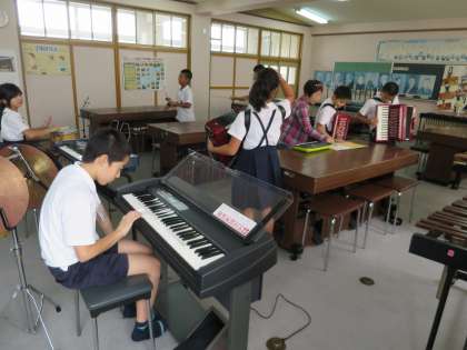 休み時間の音楽室で、6年生が、創立100周年記念式典で演奏する合奏曲の練習をしていました。完成めざしてみんながんばって!!