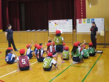 1年生の体育科で研究授業がありました。いろんな方法でボールを投げて鬼の的に当て、チームで協力して鬼の的をたおします。ボールを投げて倒して拾ってまた投げて・・・。友達のよかったところや自分のがんばりもたくさん見付けることができましたね。