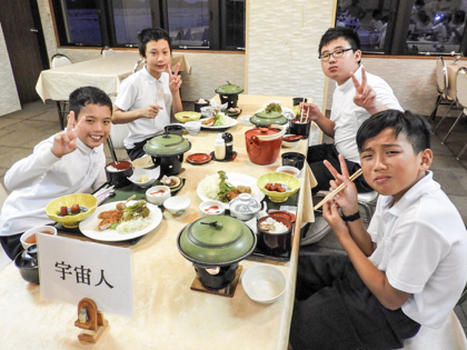 宇宙人のみなさんです。めあては「楽しい思い出をつくる!」です。ピースサインのフォーカード、以心伝心!