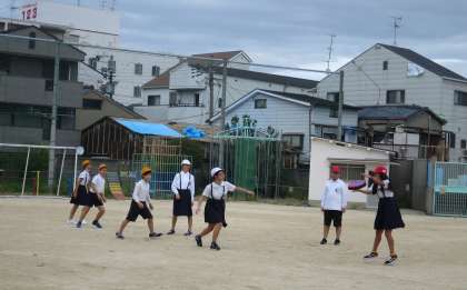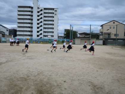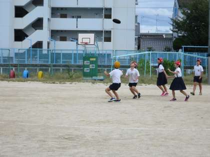 1つのフライングディスクを夢中になって追いかける5年生。休み時間のたびに運動場に出てきて楽しんでいました。落とさずキャッチしようと、全速力!