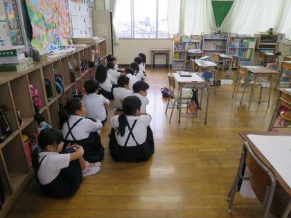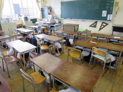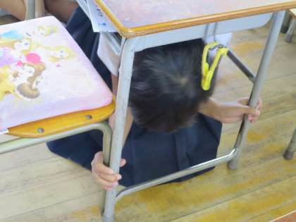 今日は、地震と津波を想定した避難訓練を行いました。普段はチャイムは1回ですが、緊急時は4回ということも再確認しました。チャイムが4回なり、放送が流れるとすぐに机の下に避難し、4階の教室に避難もしました。真剣ですばやい行動をとれていました。