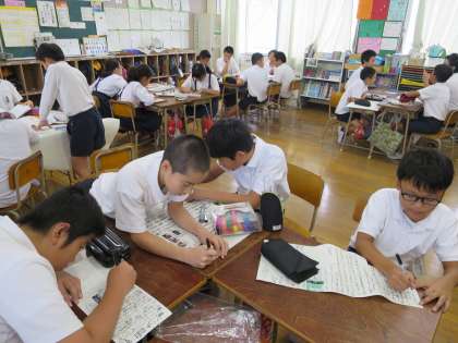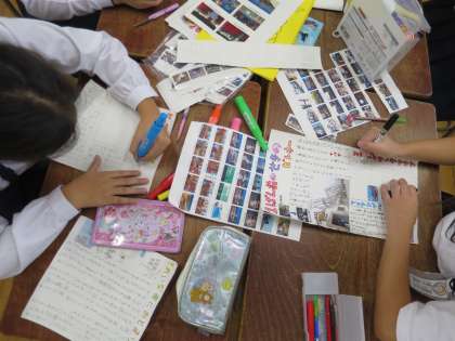 グループで、修学旅行新聞をつくっています。写真や感想も添えているので、楽しい思い出がよみがえってきますね。完成を楽しみにしていますよ。