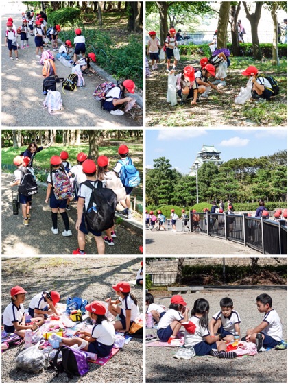 大阪城を横目に、園内を散策。途中で、どんぐりやまつぼっくりを拾いました。図工や生活科の学習に使えそうです。袋がパンパンになっている子も。